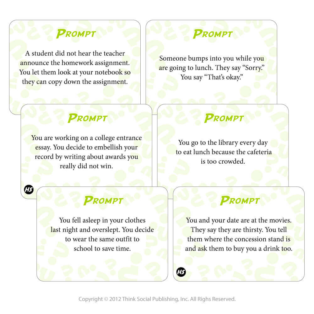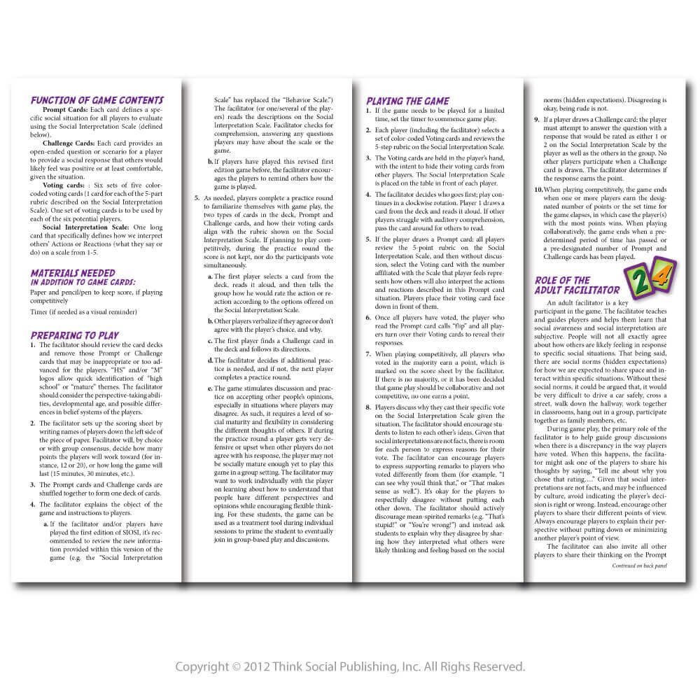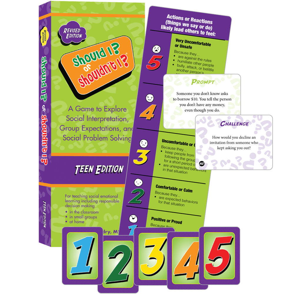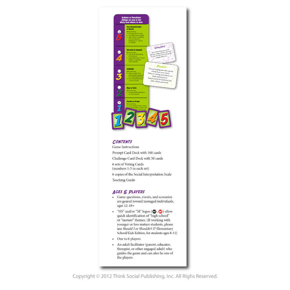 Revised and updated, this popular social learning card game provides the all-new Social Interpretation Scale to motivate teens to explore how they perceive, interpret, and emotionally respond to others’ actions and reactions and discuss group expectations across a wide variety of social situations. The new Teaching Guide and Instructions help educators, therapists, and caregivers shift students’ focus from discussing how someone behaved to instead learning about the power of one’s own social interpretation within a fun, safe, and consequence-free setting. This revised edition extends teaching the concept of the Social Emotional Chain Reaction (SECR), a Social Thinking® Methodology framework.