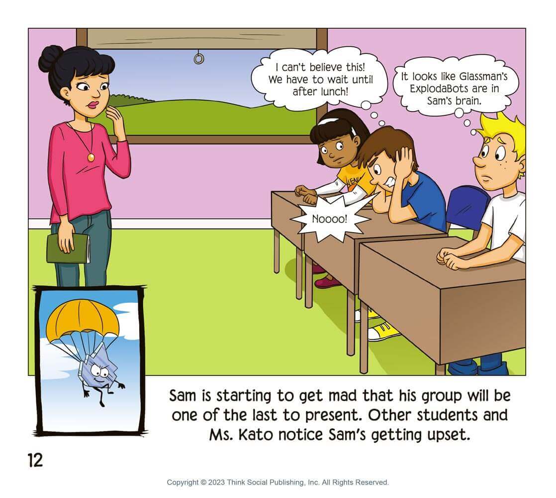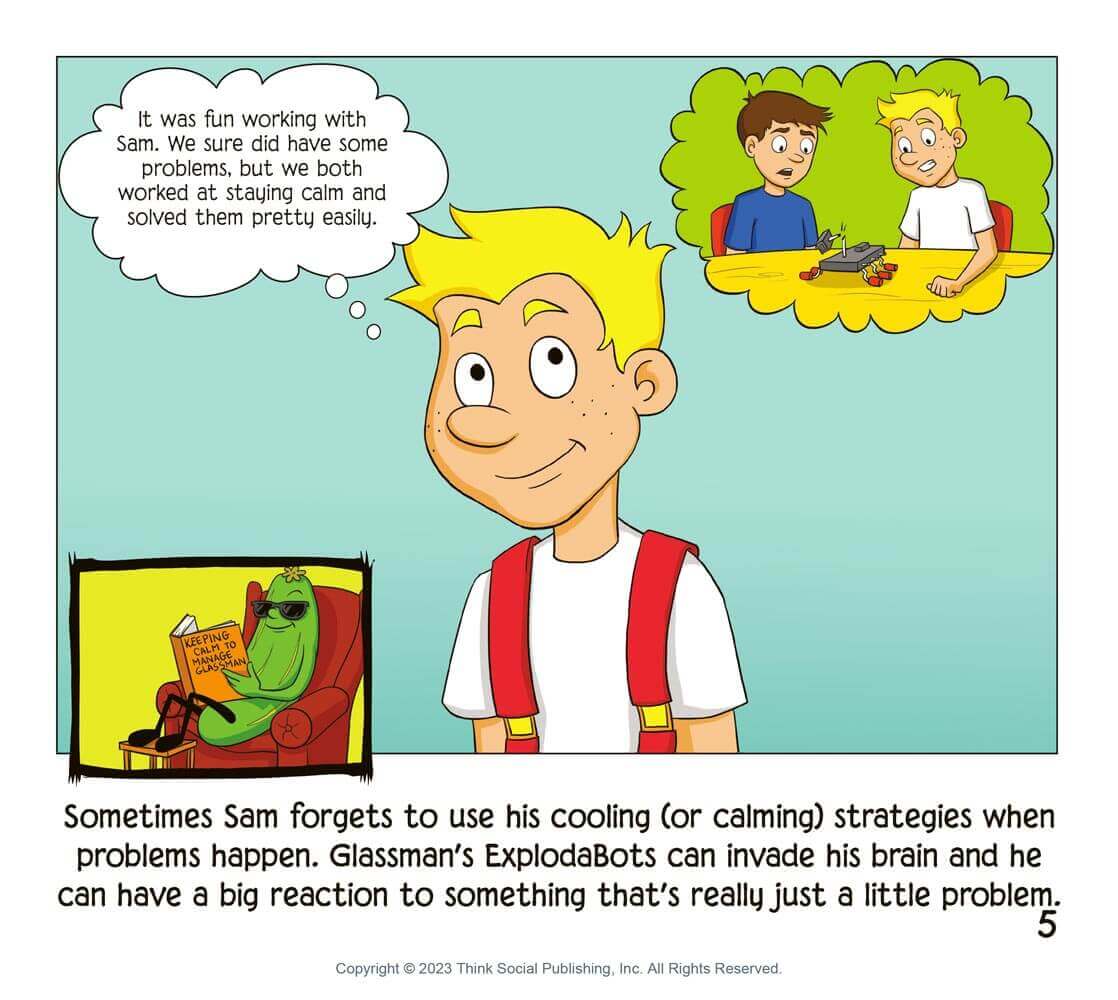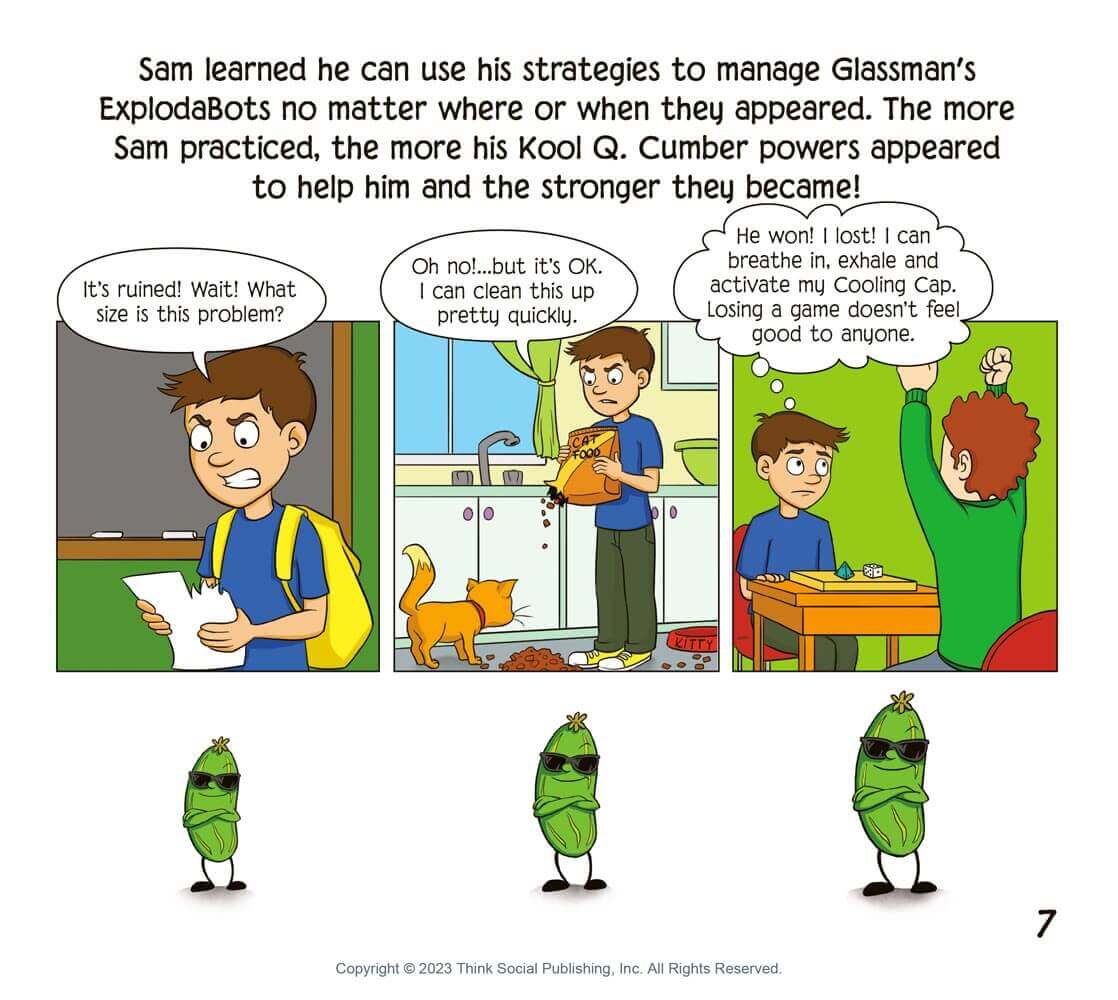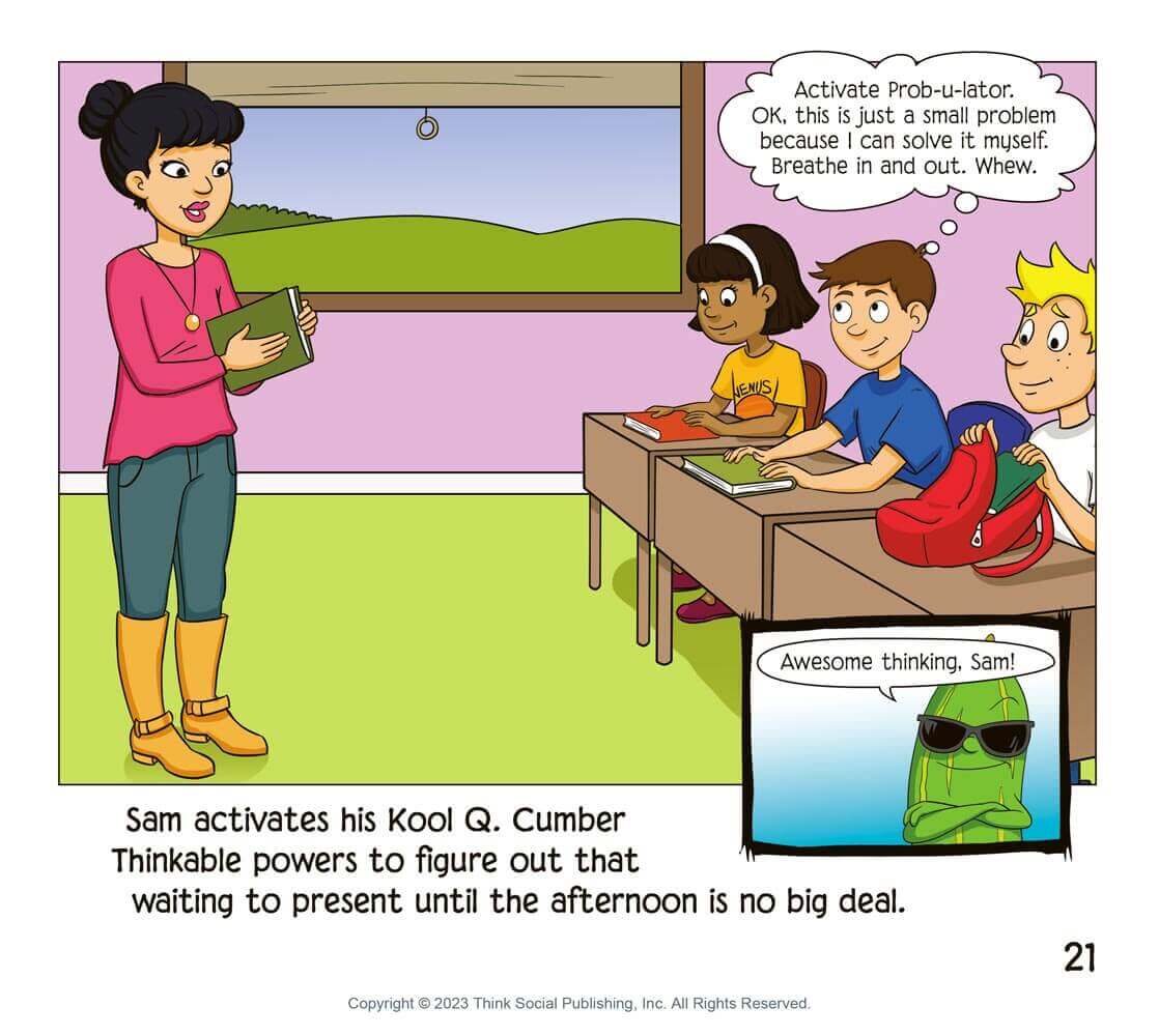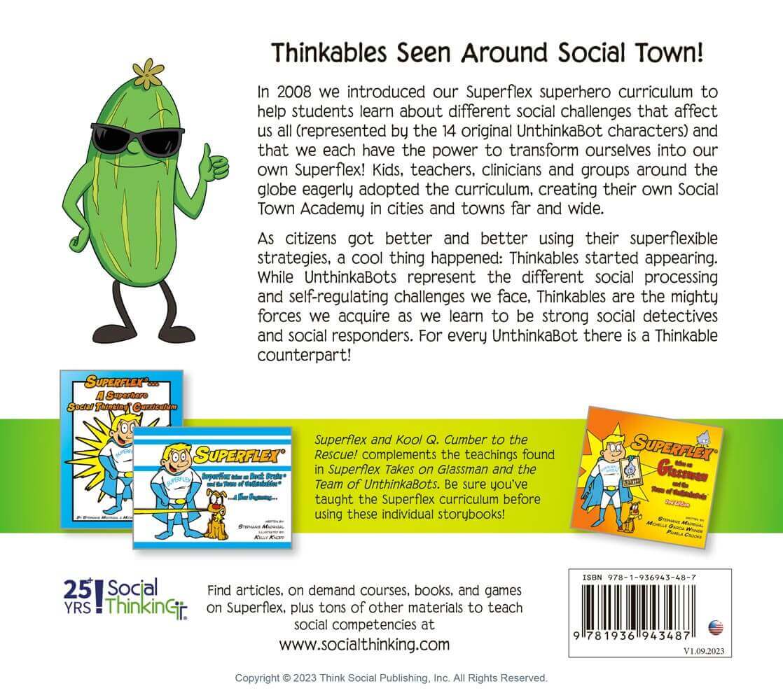 Problems come in all sizes and the Thinkable® Kool Q. Cumber (a laid back, sunglasses-wearing cucumber with arms and legs) is one way to teach kids strategies to stay cool and calm when problems arise. In this companion storybook, Kool helps us learn about activating our own Thinkable powers like the “Cooling Cap” and the legendary “Prob-u-lator.” Both strategies are designed to keep the UnthinkaBot Glassman (aka Glassy) at bay. This Thinkable companion book to Superflex Takes on Glassman helps us learn to compare and contrast problems, their size, our response to those problems, and what to do next.